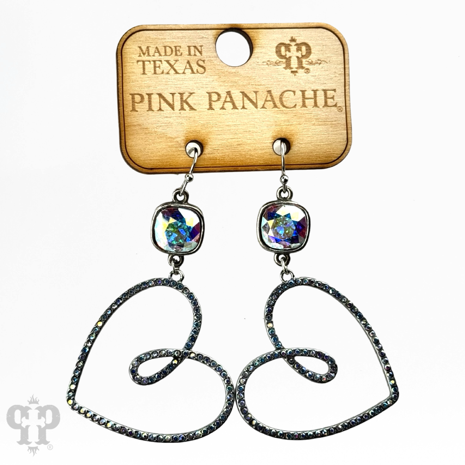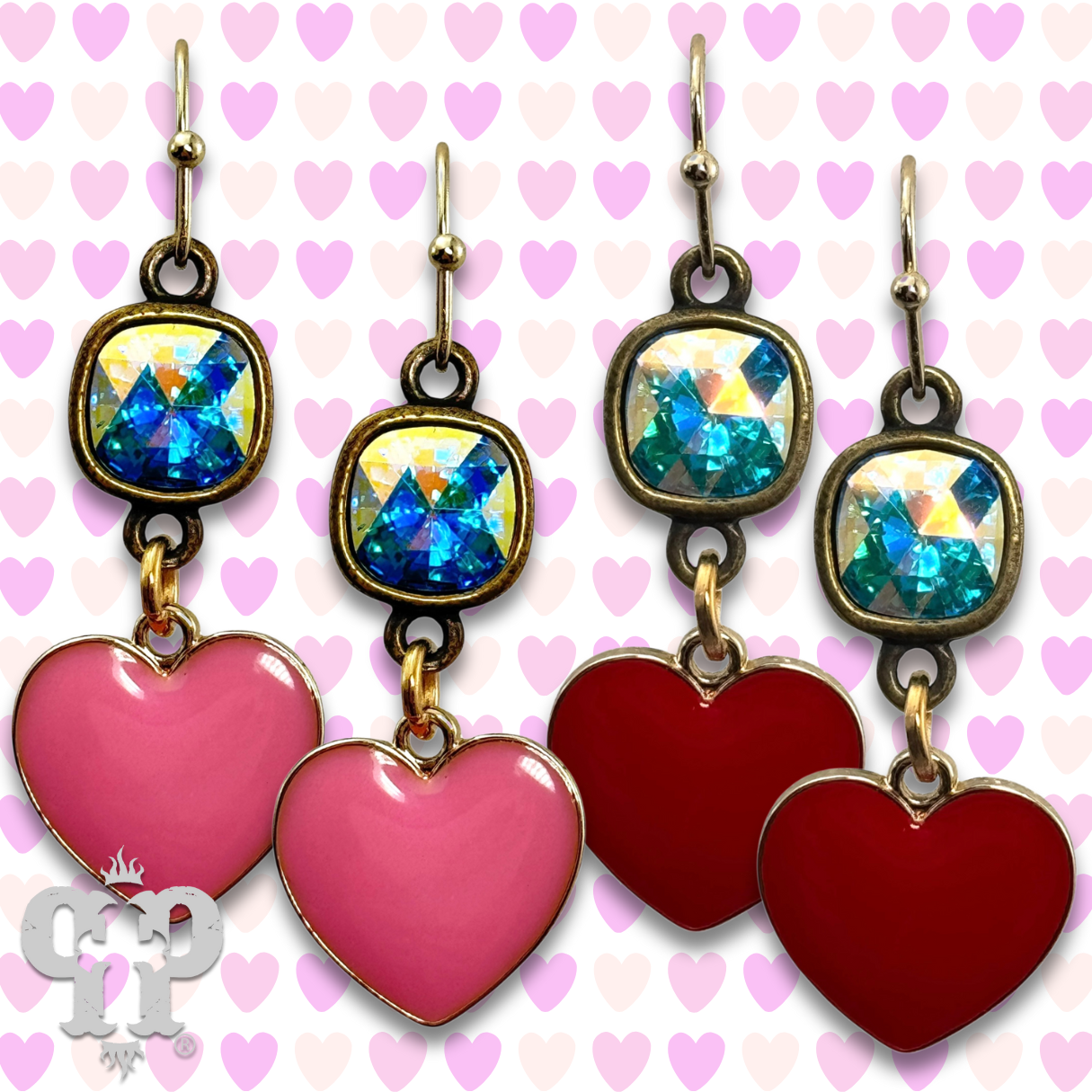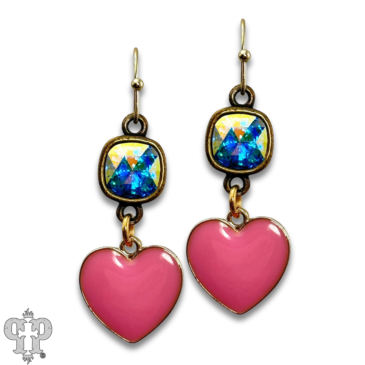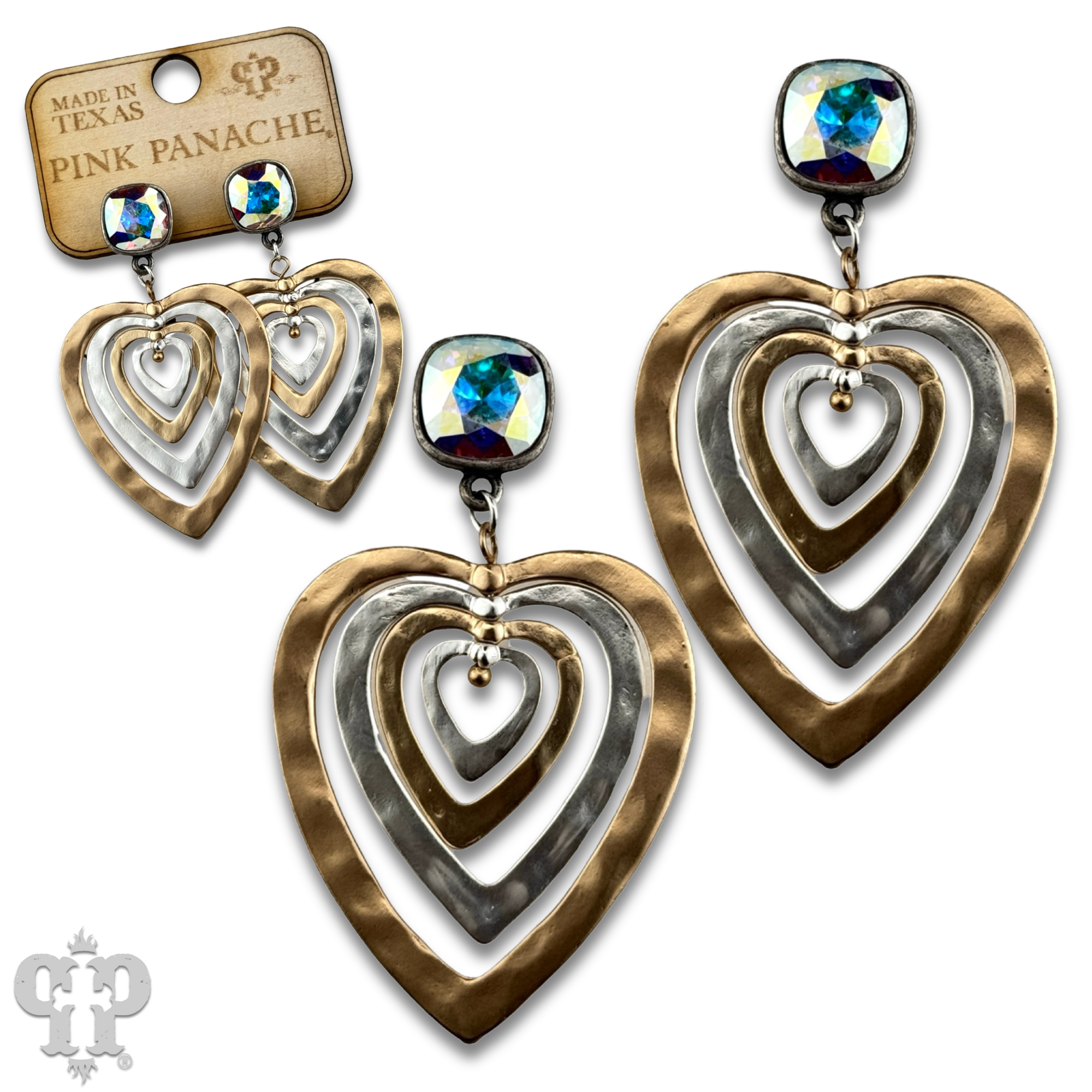 Two tone hammered heart earrings featuring Austrian crystal posts